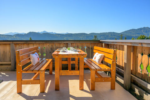 Im gemeinsamen Außenbereich laden Garten und offene Terrasse zum Entspannen, Sonnen und Genießen der frischen Bergluft ein.