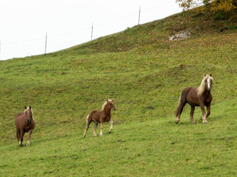 25 Kühe sorgen für frische Milch, zehn Norikerpferde samt Hengst und Fohlen genießen die Bergluft, und unsere Schafe, Ziegen und Hühner tummeln sich auf den Wiesen rund um den Hof.
