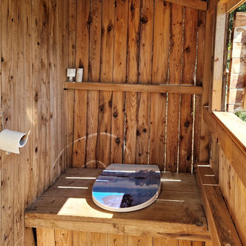 Draußen erwarten euch eine Terrasse mit Panoramablick, Sonnenliegen im Garten, eine einfache Campingdusche und ein Plumpsklo.